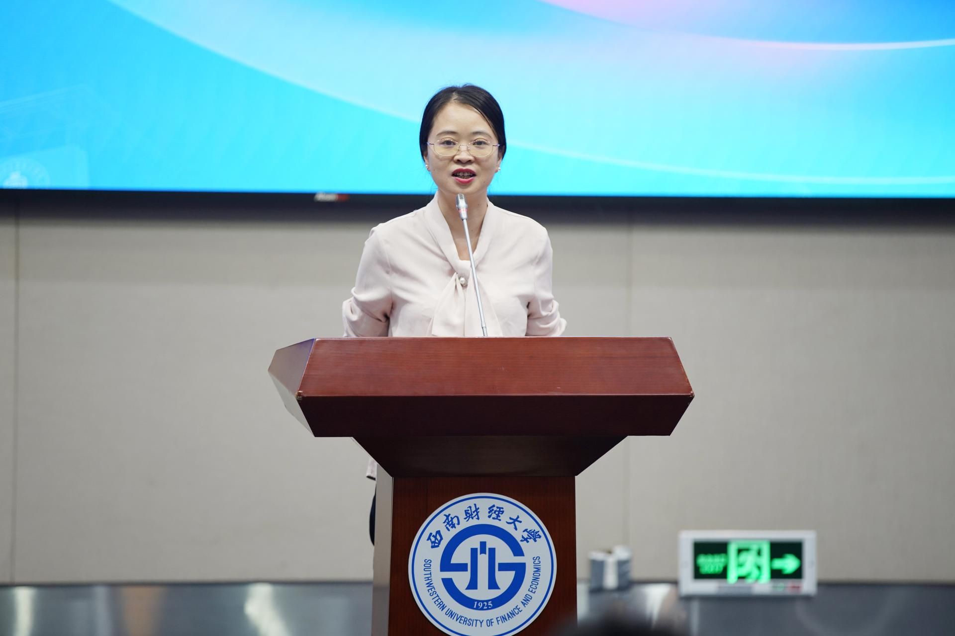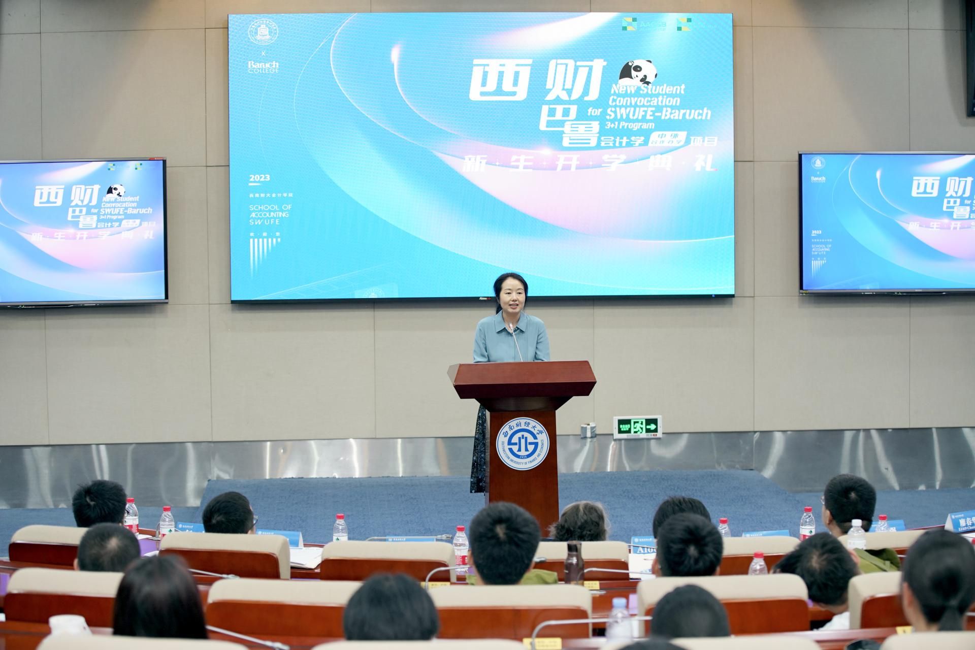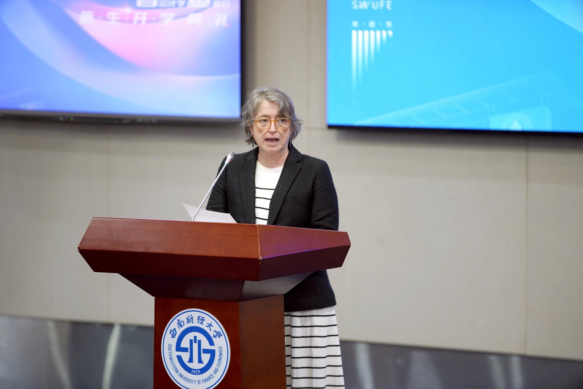 Linda Essig在典礼致辞,详细介绍了西财巴鲁项目的特色课程和优势专业,她叮嘱同学们要认真对待大学课程,积极关注全球经济讯息,开拓眼界,成就自我。