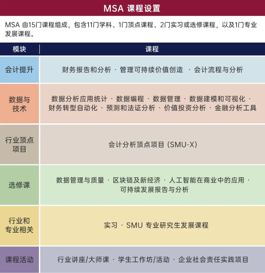 本项目提供亚洲首个会计类数据分析方向的专业硕士学位。与其它类分析课程不同,MSA 课程不仅立足于“数据”和“分析”两方面内容,而且还覆盖了数字技术在会计领域应用的深层研究与探索。
