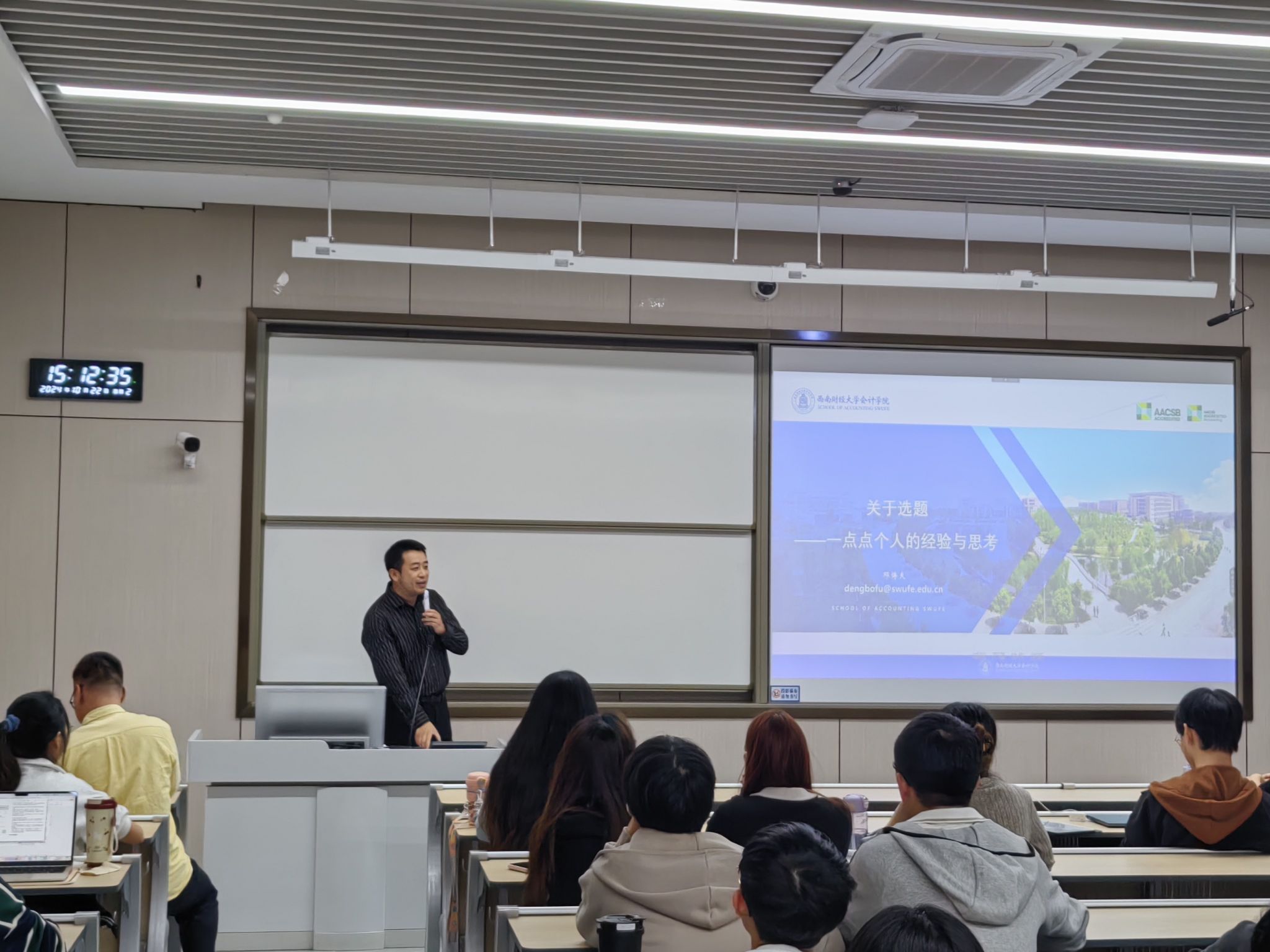 针对学术型研究生特点,邓博夫老师就如何进行实证研究开展专场讲座。他首先抛出问题:什么是好的研究生选题?邓老师罗列了确定选题的几种常见方法,通过生动形象的比喻带给大家深刻启发,并结合多个案例深入浅出地讲述了文献综述写作思路。邓老师以找到理论线索这一方法进行举例,强调研究选题应主要基于阅读文献与关注现实事件,应“小题大做”,切忌“大题小做”过于空泛。他鼓励同学们要关注财经新闻以增强对现实事件的了解,更要注重研究技能的提升,将自身投入到研究中去,实现终身研究。