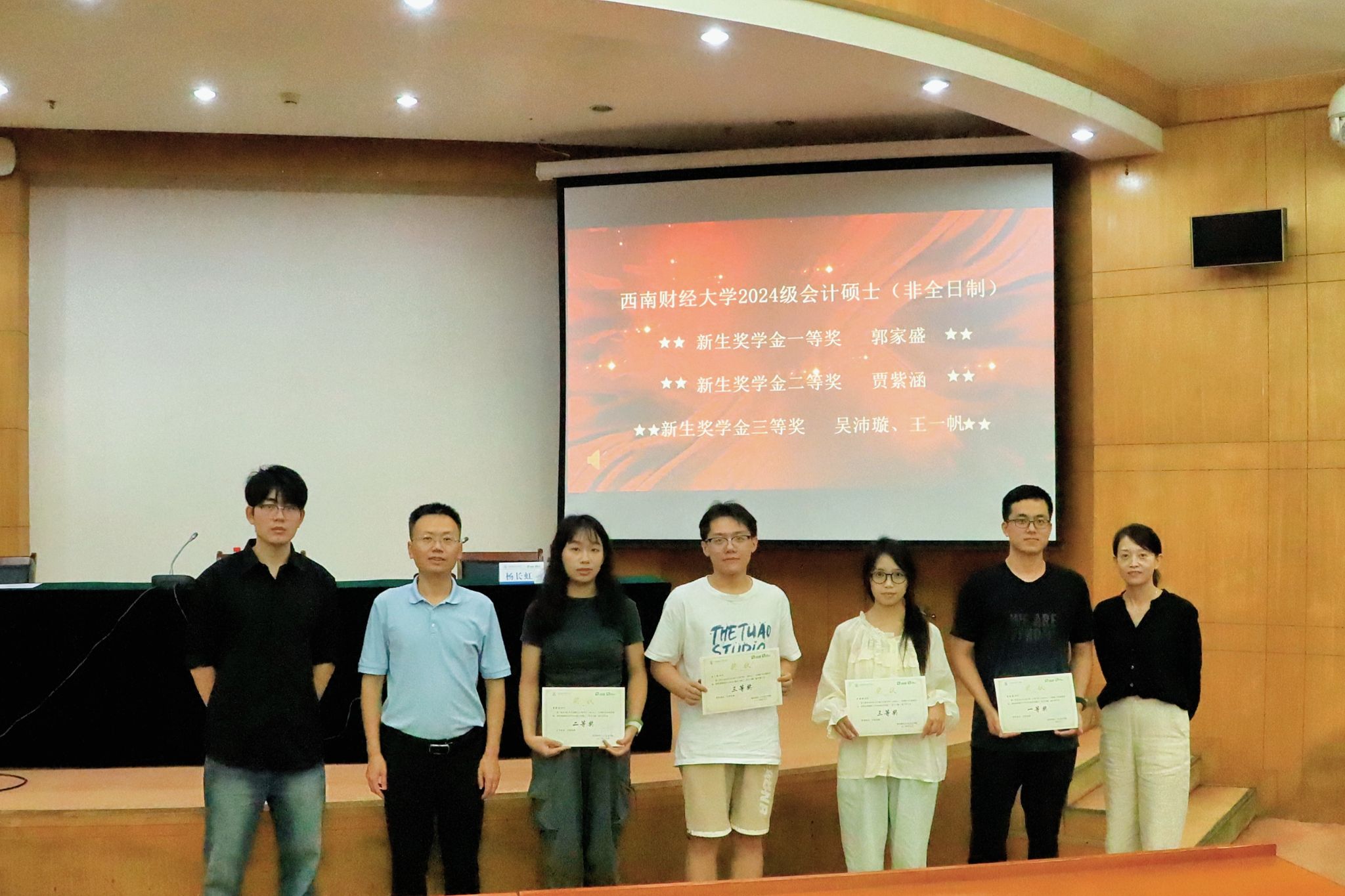 在专业硕士非全日制项目新生典礼中,为表彰先进、树立榜样、涵养优良学风还举办了2024级会计硕士(非全日制)新生奖学金颁奖仪式。副经理唐雪松、党委副书记杨长虹为获得新生奖学金的同学颁奖。